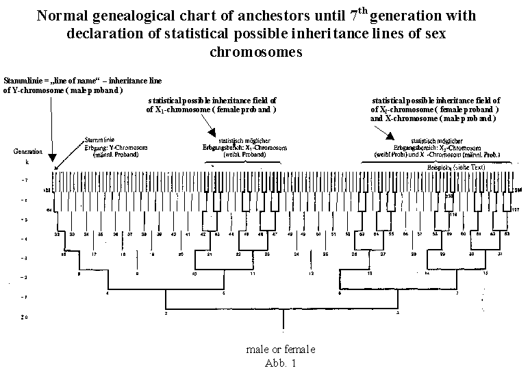 k = -3. All possible inheritance lines for the sex chromosomes for seven generations can be seen clearly in figure 1. It is differentiated between male and female probands. For the individual inheritance case of the X chromosomes designated x1 and x2 it is a question of only one single line. For example, for x2 , such a line is 238-119-59-29-14-7-3-1. Moreover, from the seventh generation on, there are twenty additional inheritance lines, some with greater, some with lesser statistical probability. From the two illustrations it is clear that there are basic differences between ancestral charts with male and female probands. The author is not aware that this fact has been referred to previously in the scientific literature. The genealogical table of a male proband is characterized on the one hand by the clear transmission of the Y chromosome within the so-called male line, and on the other hand by the inheritance probability field of the single X chromosome. The genealogical table of a female proband is characterized by two independent inheritance probability fields for the two X chromosomes (X1 and X2). Thus the X2 field of a female proband is identical with the X field of a male proband. The possible inheritance paths for the eight combinations
