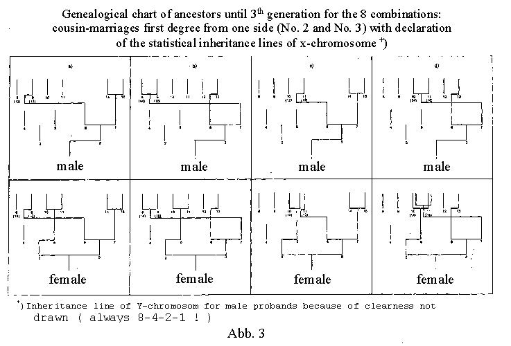 the example of a human genealogical table. A male person, for example the proband number 1 himself, receives his X chromosome with certainty (probability 1) from his mother (number 3) only. She herself, however, inherited this chromosome either from her father (number 6) or from her mother (number7), and with equal probability, so that both probability values are halved in the transmission to the next generation (see table 2). Therefore the probability is 0.5 for each. From ancestor number 6 the probability value does not chance in the transmission to the next generation, since ancestor number 6, as a male. can receive his X chromosome only from his mother (number 13); the probability of number 13 therefore remains 0.5. While for the female ancestor number 7, parents number 14 and number 15 come into play as transmitters with equal probability, the probability values therefore are halved again in the transmission to the next ancestral generation (probability of number 14 and number 15 is 0.25 each). This will suffice as a description of disproportionization. The Y chromosome, always passed only from father to son, has a completely unambiguous inheritance line on the genealogical chart. The probability value for the Y chromosome within the principal line is therefore always 1, independent of the generation. If, for example, in the case of a great-grandson, the entire legacy has disappeared in the individual case, his Y chromosome still remains fully preserved. In table 2, the probability values are given for all ancestors up to the generation k = -6. The nomenclature is that of today's scholarly genealogy. Naturally the b values in the chart for the X chromosome (bx for the man, bx1 and bx2 for the woman) are always 0 or 1 [because of crossing over, 0 or 1 is valid stritcly speaking only for single genes, which are localized on the X chromosome!] in the individual case, namely 1 only once in each ancestral generation (in the case of one ancestor) and 0 in all other positions (note 10). Those positions on the genealogical chart marked with a line in table 2 are eliminated for an inheritance probability of the sex chromosomes on the basis of the X-Y mechanism. There are "free places" and "new" areas in each higher ancestral generation. The percentage of "free places" becomes increasingly bigger within the chart as one goes back in time. The "free places" can in given cases be filled in the case of multiple inheritance (for example, ancestor 12, if the same as ancestor 10, (if ancestor 6 and 7 are brother and sister) female proband; see illustration 3c). Such ancestral charts, which show loss of ancestors, also called ancestral implex, will, however, not be looked at more closely in these basic considerations within the first ancestral generations. Admittedly, loss of ancestors will be the rule in higher generations, and the "pure" numerical relationships will be obscured, partially through "shifting of generations", such as niece-uncle marriages. In our civilization, marriages of close relatives are no rarities.