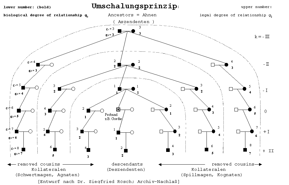 Roman numbers inside brackets: generation number referenced to proband.Figure from: Dr. Siegfried Rösch, Goethes Verwandtschaft, Neustadt/Aisch, 1956.