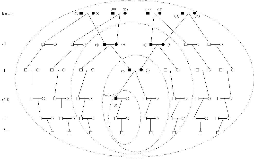 Arabic numbers inside brackets: ancestral number v with reference to proband.